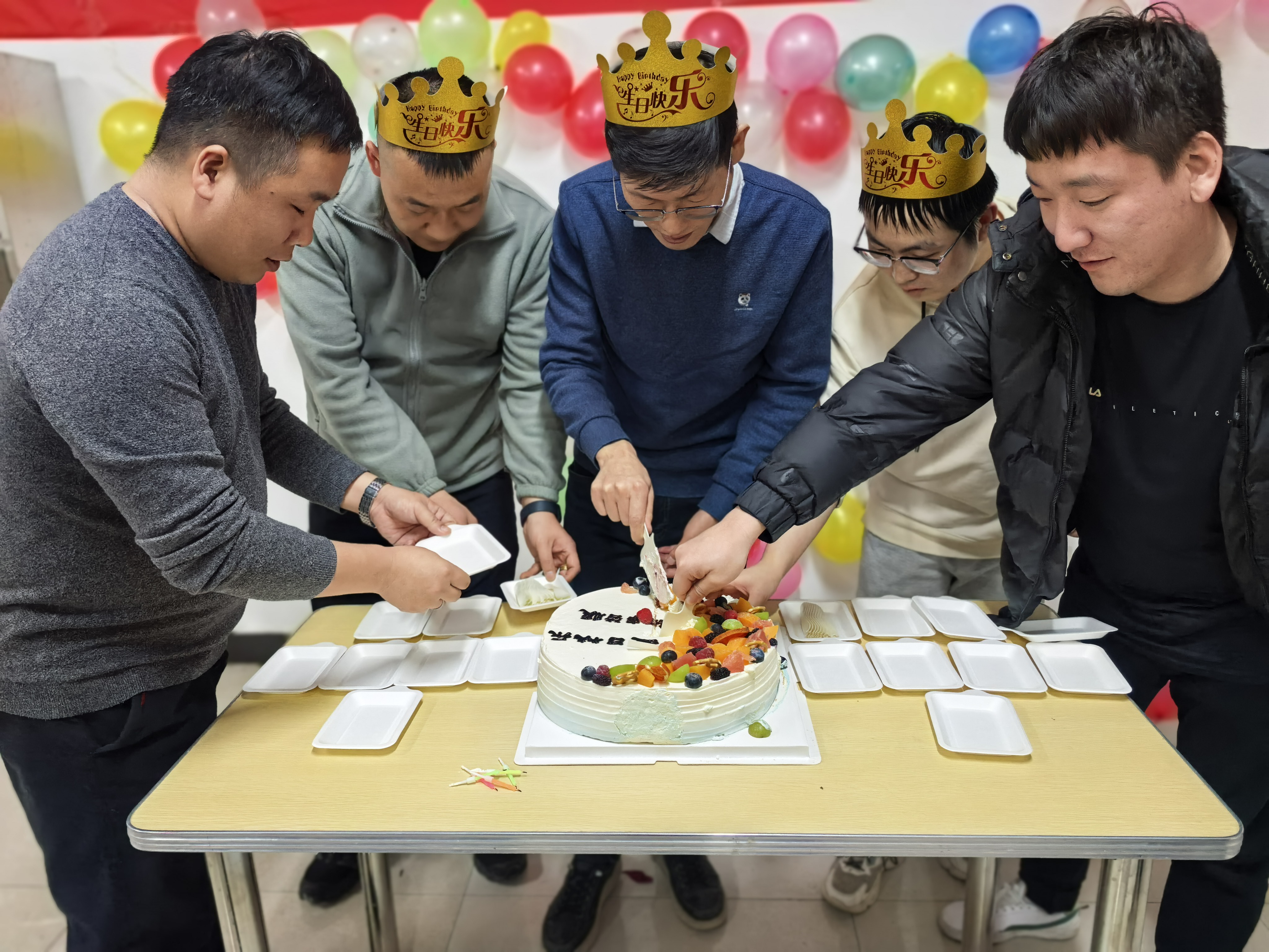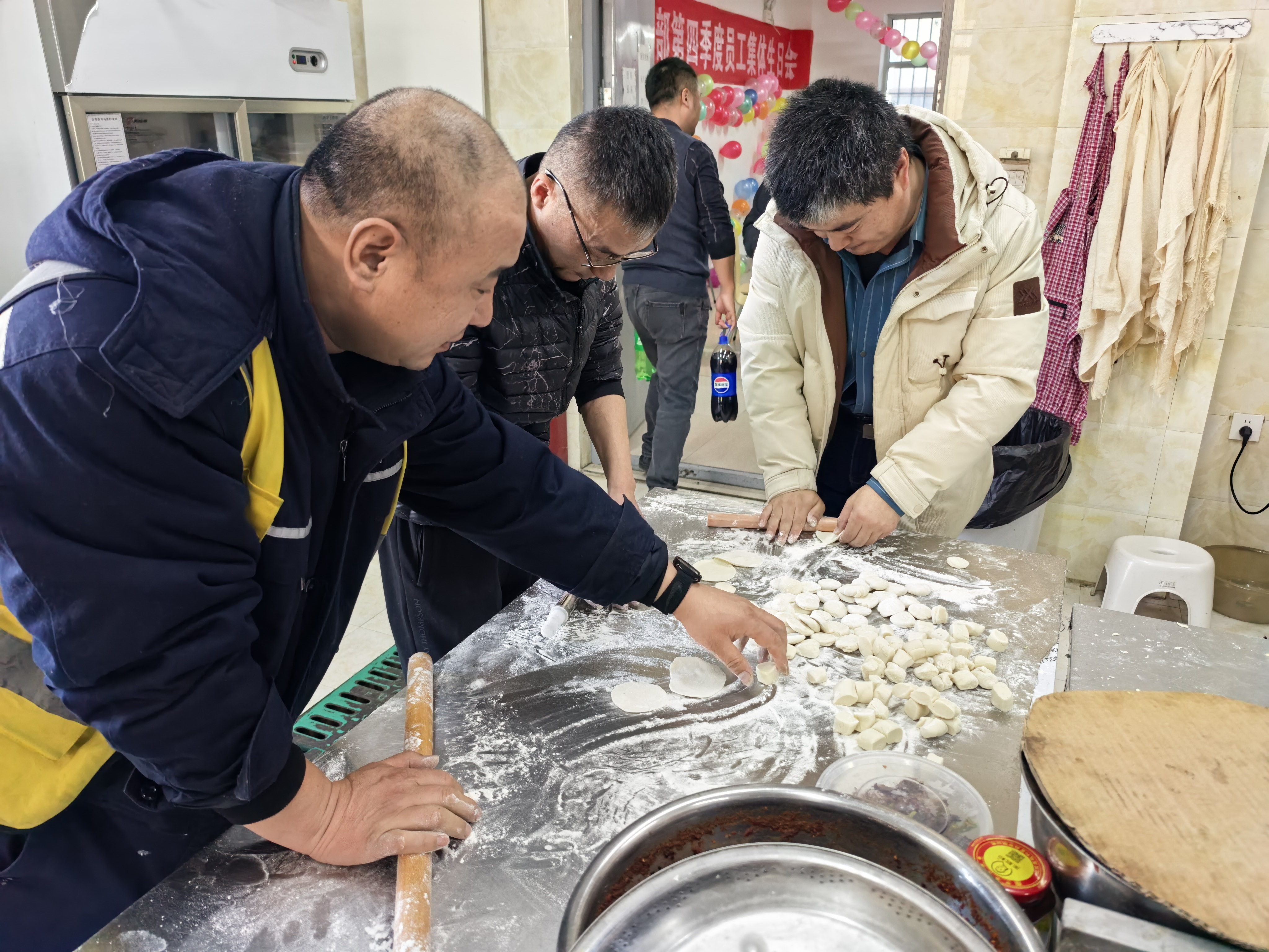 当天下午,餐厅被布置得色彩斑斓,缤纷气球错落悬挂,装饰点缀其中,营造出浓厚且温馨的氛围。生日会上还准备了精美的生日蛋糕和各种美食,包括糖果、水果、饮料、瓜子等一应俱全,让同事们尽情享受美食的盛宴。不仅如此,项目厨师李师傅还组织大家一起包饺子,为大家带来一场味觉的盛宴,同时让大家感受到了家一般的温暖。