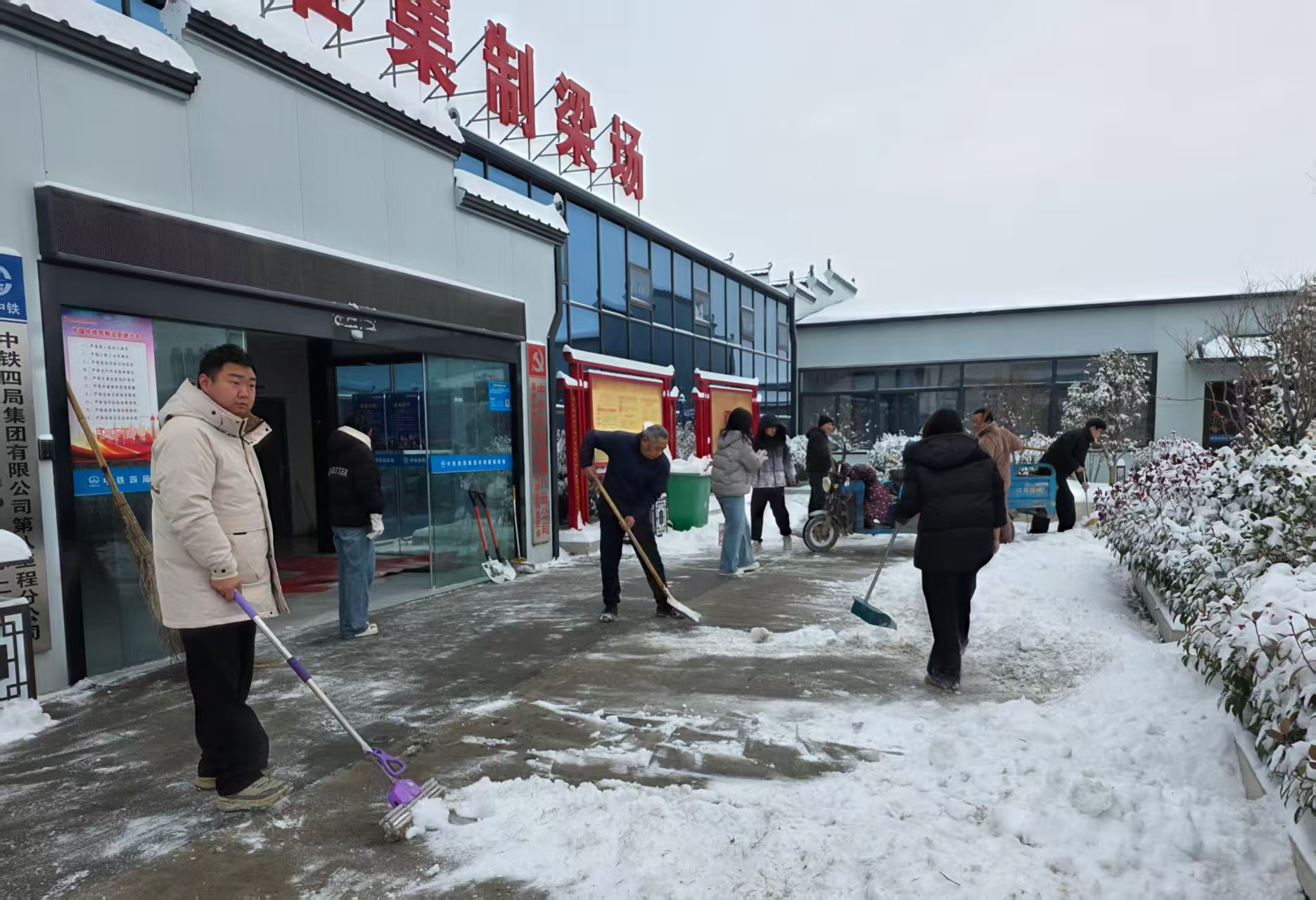 面对突如其来的降雪,项目党支部第一时间进行部署,党支部书记江洪、组织二十余名青年员工,携带扫帚、雪铲、等物资,在办公楼进出大厅、主要人行通道等重点区域开展清雪除冰作业。青年员工们不畏严寒、齐心协力,有的负责铲除压实冰雪,有的负责清扫残雪积水,有的负责撒布防滑物料,现场分工明确、配合默契。经过近一小时的连续奋战,办公楼前主要通道、台阶及周边人行道积雪结冰全部清除干净,通行条件得到显著改善。