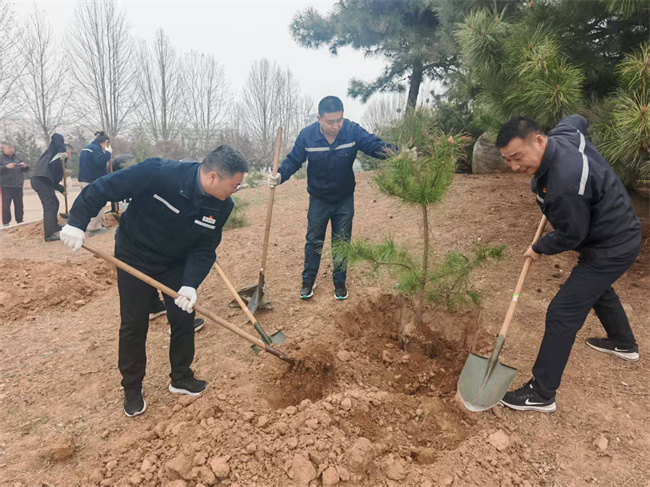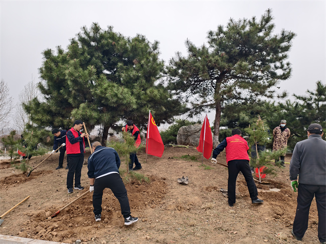活动现场,党员同志充分发挥先锋模范作用,带头冲锋在前,他们身着志愿服装,带着铁锹、水桶等工具,迅速投入到植树劳动中。大家分工明确、默契协作,挖坑、扶苗、填土、踩实、浇水,每一个环节都一丝不苟、有条不紊。大家秉承不怕脏、不怕累的精神,挥锹铲土劲头十足,现场一派热火朝天的劳动景象。经过大家的共同努力,百余株树苗错落有致地扎根沃土,迎风挺立,为红色西柏坡增添了一抹鲜活的绿意。