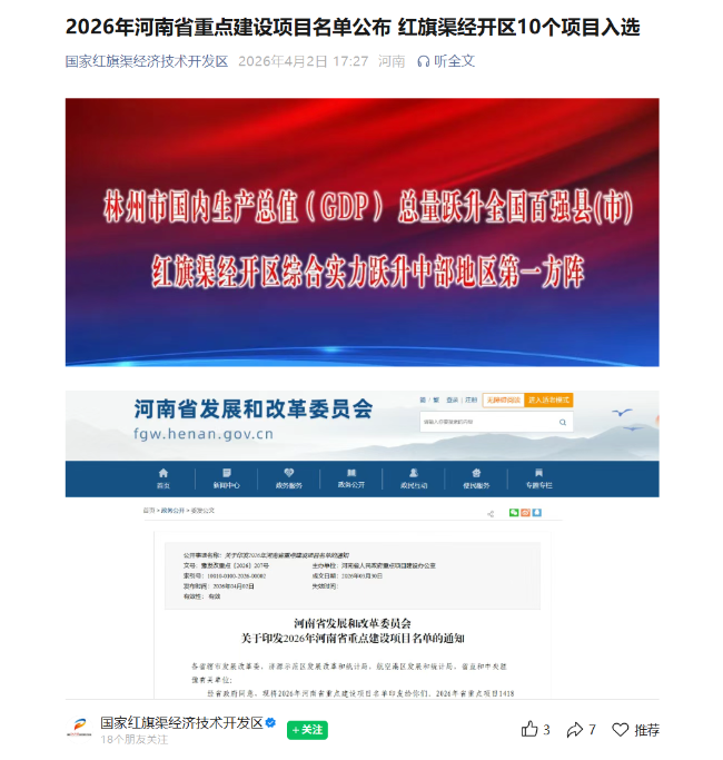 4月2日,河南省发展改革委正式公布2026年河南省重点建设项目名单,中铁四局八分公司承建的红旗渠经济技术开发区专用铁路项目成功入选,成为林州市本次上榜的10个重点项目之一。