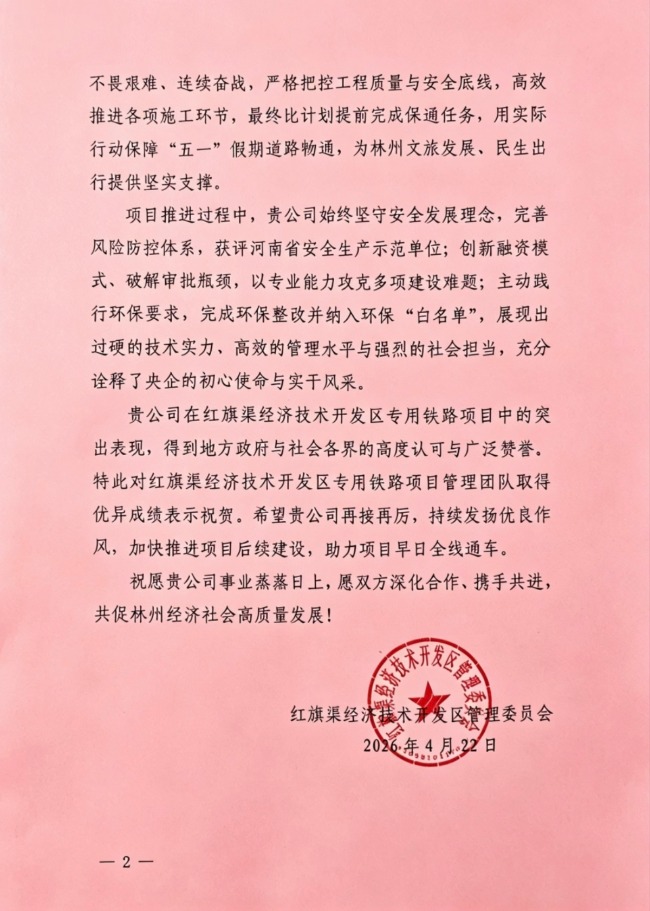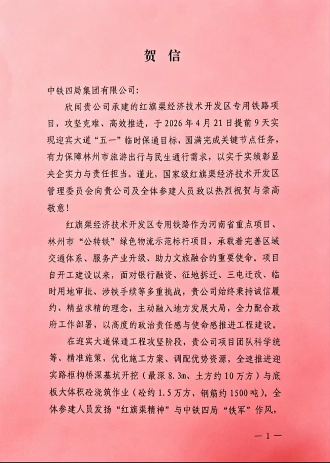 贺信中,红旗渠经开区对项目团队发扬红旗渠精神和央企铁军作风、高效履约给予高度肯定,认为此举有力保障了林州文旅发展与民生出行。中铁四局表示,将持续加快区间、桥涵、站场等后续工程建设,全力冲刺年度目标,力争项目早日建成通车,助力地方经济高质量发展。