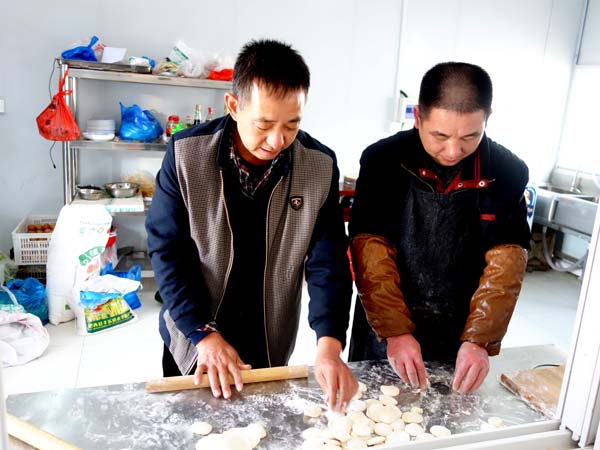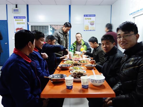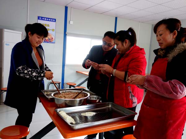 “饺子出锅啦!”大厨魏师傅刚把热气腾腾的饺子放到餐桌上就被兴奋的职工们一抢而空。“好辣好辣!饺子里怎么还有辣椒啊!”轨排队技术员王民明辣得直跺脚。“恭喜啊,吃到辣椒来年红红火火呀!”其他职工们起哄地说道。这是2014年12月31日合肥地铁项目部餐厅热闹的一幕。