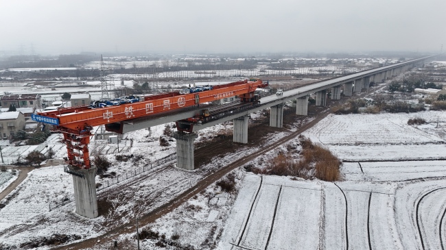 2026年1月1日,江淮地区出现降雪天气,宁淮城际铁路架梁施工现场作业区域被积雪覆盖,项目部迅速组织施工人员清理积雪,全力保障架梁施工。
