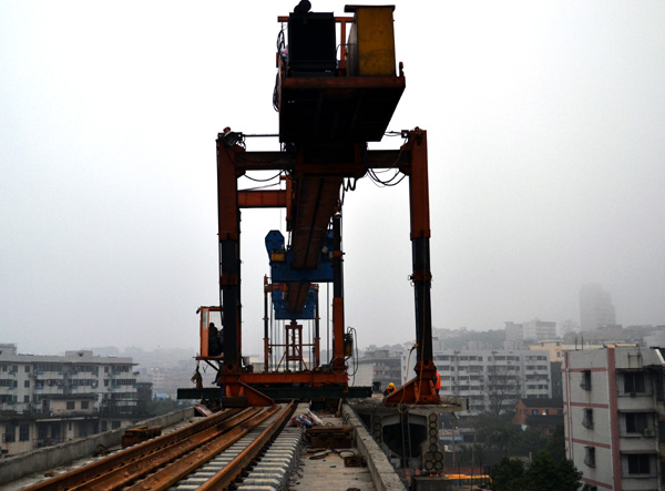那天,第一场春雨,我站在工地附近的大树下,密密麻麻的叶子足可以当成一把伞。雨,淅淅沥沥的,千万条细线,荡漾在空中,像迷迷漫漫的轻纱。不象是雨,象是雾,眼前的世界似乎被封锁在淡蓝色的雨丝中。远远望去,街道、楼房、行人,眼帘中映现着模糊的轮廓;清晰地只有我们的180型架桥机,正将一片百多吨的32米T梁,缓缓落放在南宁铁路枢纽普速客车整备所走行线北湖特大桥左线的桥墩上,工人师傅顶着细雨忙碌于小半径架梁。