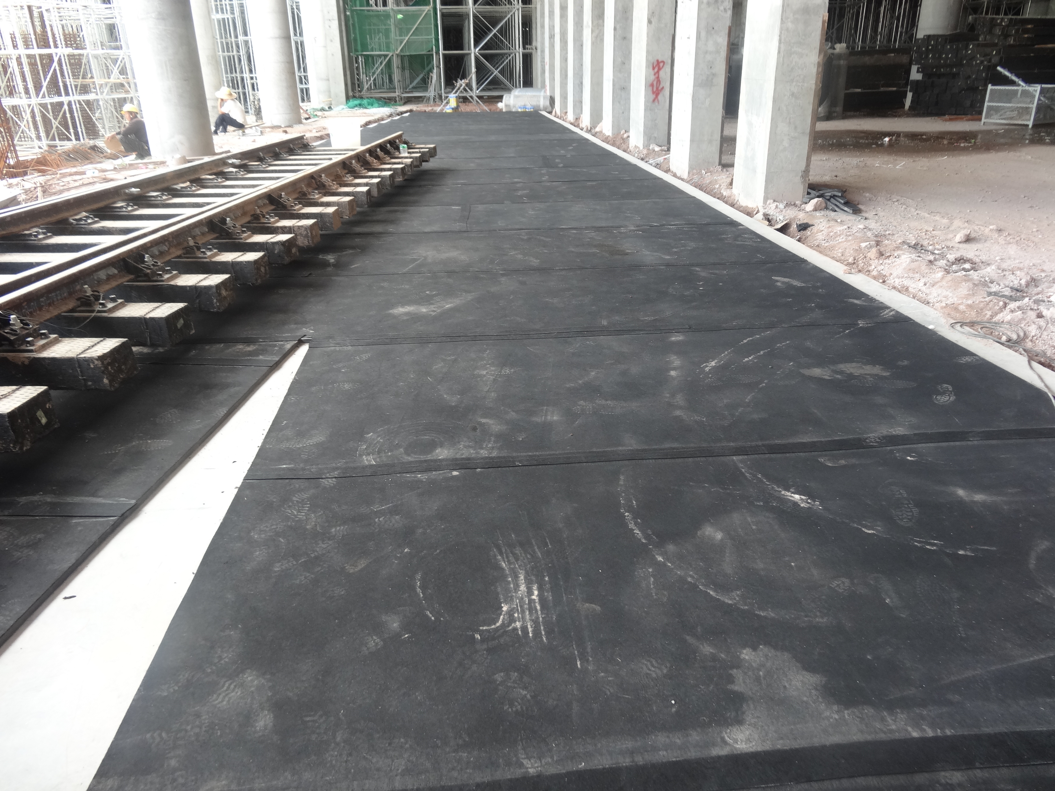 广州官湖车辆段建筑物设计分为三个区,下层为车辆段检修库及运用库,中层为商业区,上层为住宅区。当地铁车辆通过道岔区时,因道岔轨型的特殊性,产生了较大的噪音和振动,影响了中上部商住区的环境舒适,为了减少地铁车辆运行产生的各种噪音和振动,该项目部通过铺设道砟减振垫来达到减振降噪的技术措施,确保中上部商住区的生活环境需求。道砟减振垫在铺设前首先要保证垫层表面不得有混凝土浮渣、杂物、明水、油污,并保持干燥。以高质量的标准来进行拼缝焊接,焊接时,在道岔直股端将需要焊接的两片减振垫边缘对齐,压平整,保证缝隙均匀。根据现场温度、湿度等条件合理调节热风机档位,沿减振垫接缝以15mm/s左右的速度匀速直线向前推进,以保证焊接质量。