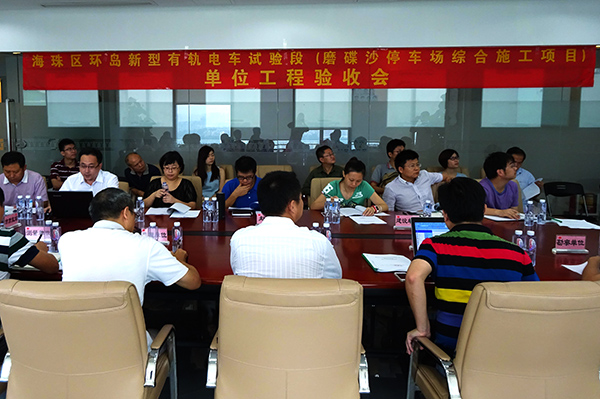 2015年7月17日,广州有轨电车项目部承建的广州市海珠区环岛新型有轨电车试验段【磨碟沙停车场综合施工项目】顺利通过了单位工程验收。在广州市有轨电车有限责任公司的组织下,工程质量监督站和工程建设、设计、监理、测量、勘察、施工单位的人员参加了会议。