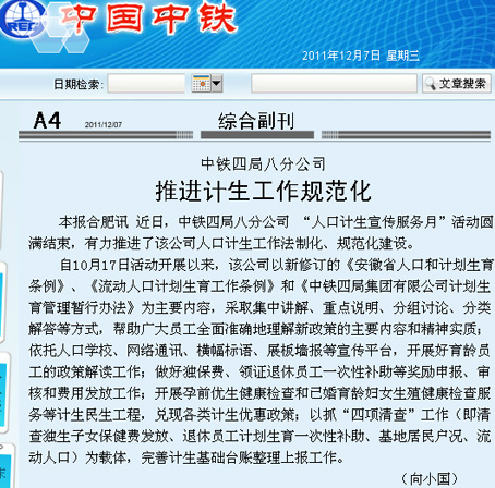 《中国中铁》:中铁四局八分公司推进计生工作规范化