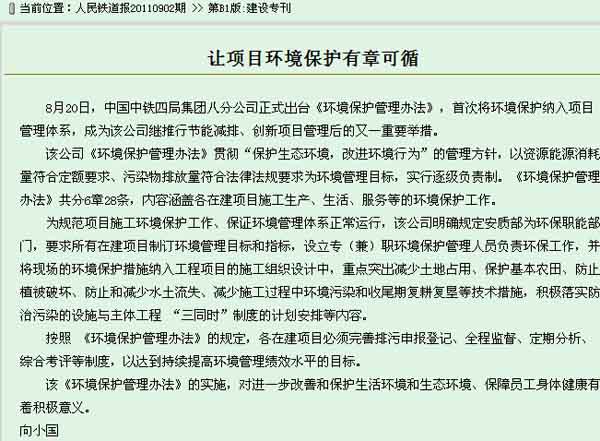 《铁道建设》报:八分公司将环境保护纳入项目管理