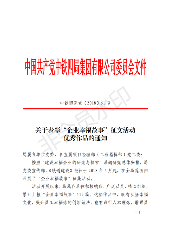 从祖父辈的风餐露宿、栉风沐雨到父辈的四海为家、不惧艰辛,再到现在我们的以人为本、幸福企业,在半个多世纪的风雨历程中,中铁四局集团一直在克服各种艰难险阻,树起起一座座“丰碑”。四局无疑一直在朝着更好的方向发展,这得益于有“勇于争先,永不满足”的企业精神不断引领、激励着我们。我们没有华丽的言词,只有默默的付出;没有惊人的壮举,只有数十年如一日不懈的坚持。而这一份付出、这一种坚持的背后,是用汗水铸就此生无怨无悔的博大情怀,是在日日坚守和默默奉献中闪耀光芒的进取精神,是因勤勉履职和勇于担当而成就出彩人生的事业态度。让我们携手并肩、脚踏实地,勤勉履职、敢于担当,在负责任、尽责任的奉献中实现人生的价值、享受人生的快乐,在平凡的工作岗位上演绎出精彩的、不平凡的人生!