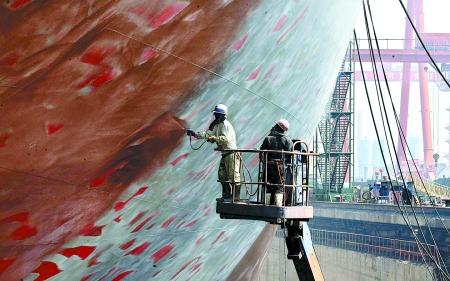 5月1日,在山海关山船重工修船基地,两名工人为一艘外轮进行船体外板涂装作业。