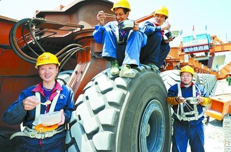 5月1日,中铁四局八公司架梁工人在施工现场吃午饭。