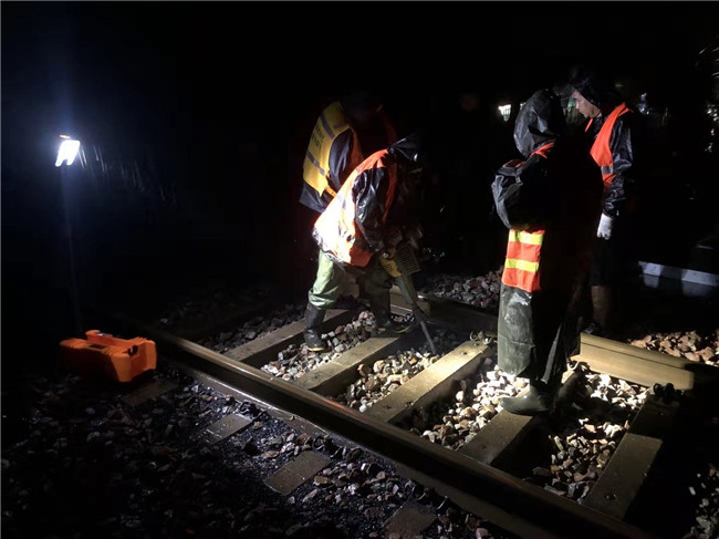 7月21日夜间连续降雨量达到警戒值,八公司朔黄运输分处副分处长陈学兵、国能朔黄公司副总经理尹成斐到达西柏坡行车室指导各单位开展防洪巡检工作。西柏坡车站汇报朔黄公司调度指挥中心后,停扣上下行线运行列车并封锁区间。巡视人员巡检发现区间轨枕悬空险情,待命在西柏坡站附近的4家施工单位220人和2台捣固车,纷纷投入到了紧张的抢修战斗中。储备在西柏坡站的C70E型片石车3辆75方、石屑车7辆175方、石砟车19辆475方派上了用场。7月21日夜间车站组织开行路用列车16列、出动巡检抢修人员275人次。