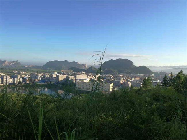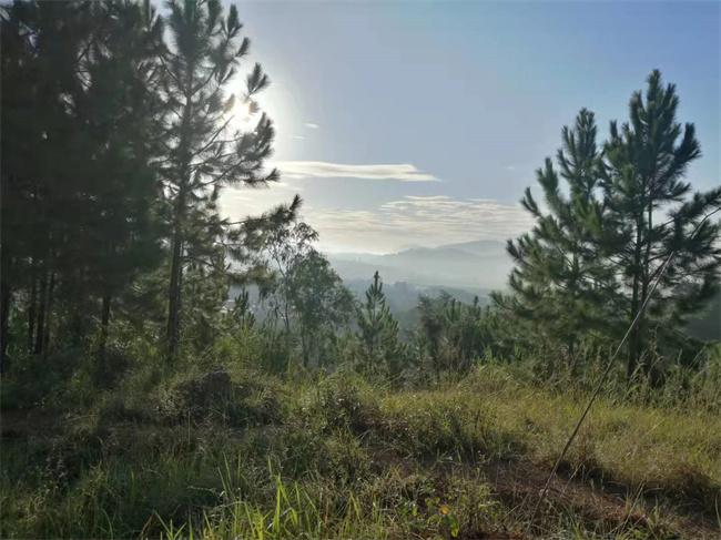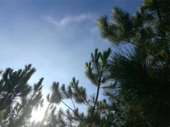 说是爬山,其实只是稍陡一点的山路,由于小山包并不是很高,加之行走的不是很急,所以并不觉得累。行至半山腰的拐弯处,我才停下来缓缓劲儿,回过身来向山下望去,才发现来路的景色和刚才大不相同,别有一番景致。沿着小路向上继续攀爬,不一会儿功夫就上了山顶。站到山顶,我的心胸顿觉开朗:山顶的四周绿荫环绕,阳光透过稀疏的松枝撒落在脚下,松树的树枝在微风中轻轻地摇摆,时不时有不知名的鸟儿扑楞着翅膀从树枝上飞起,落到不远处的树木中。我向山下俯瞰,百合镇的房屋错落有致,田野到处是一片葱绿,种植的是水稻、甘蔗、香蕉等各类农作物。再向远处眺望,蓝色的天空中白云轻轻地飘浮,大大小小、形态各异的绿色山包连绵不绝,共同构成了百合镇特有的自然风光景色。此时此刻,我的心情大好,用“心旷神怡”来形容也丝毫不为过。
