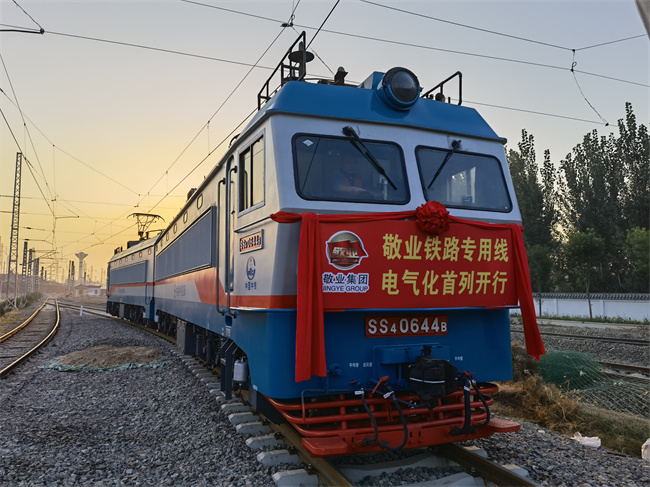 9月30日938分,由中铁四局八分公司SS4G0644机车担当K6555次列车,完成由西柏坡站交接场发往敬业站牵引任务,标志着河北敬业集团铁路专用线电气化正式开通,也标志着公司运输业务实现了涵盖“车、机、工、电、辆”全专业运营管理