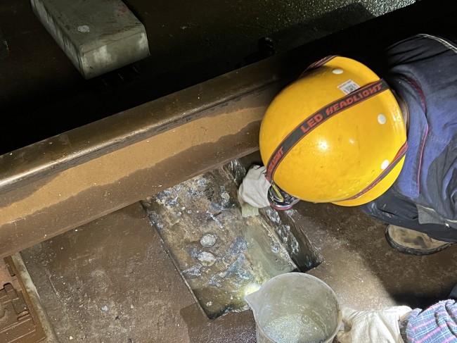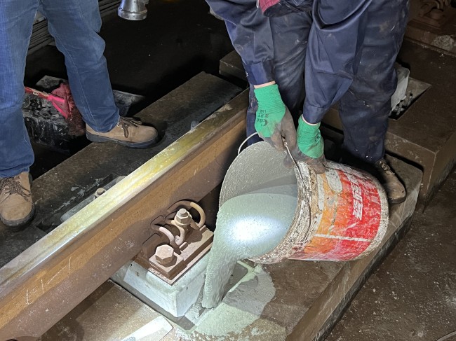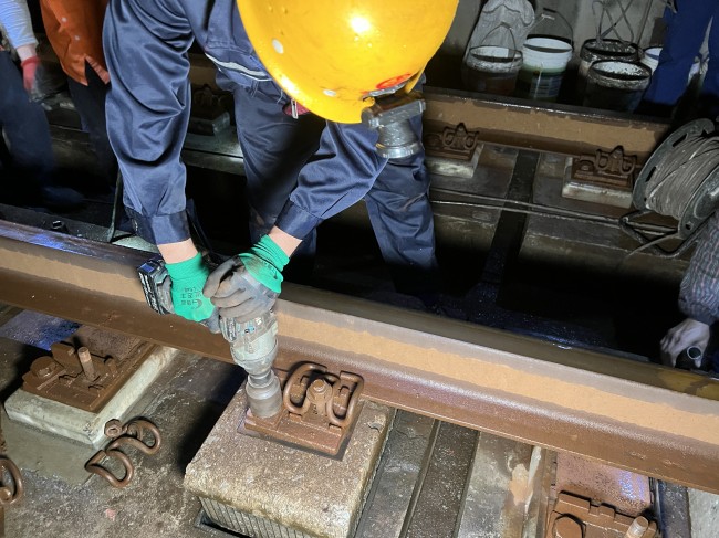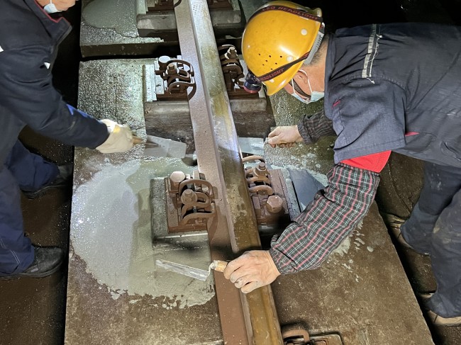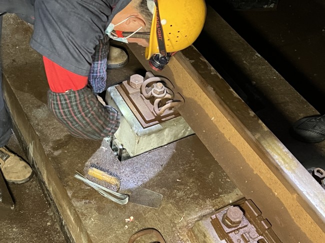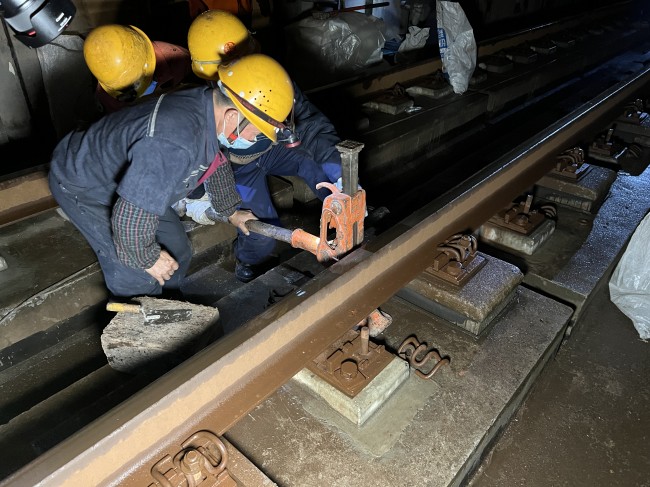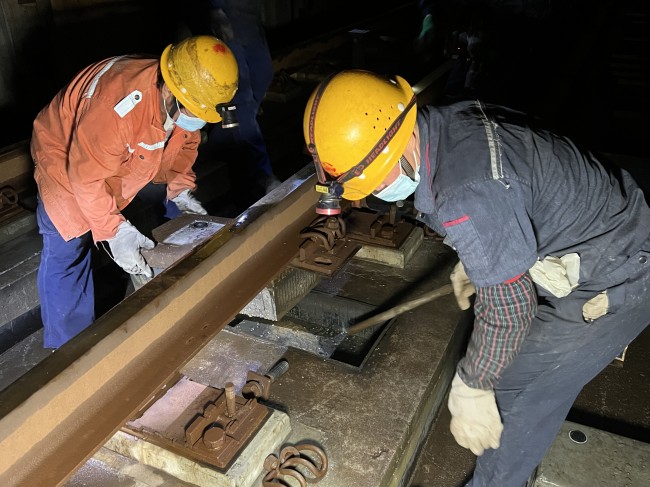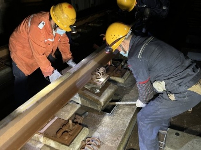 施工指令下达以后,施工人员进场开始操作:拆除扣配件、起道机起轨木枕抄垫、拆除旧支撑块、拆除橡胶套、凿孔清理吸尘、刷胶、安装新支撑块、落轨、安装扣配件、打孔安装钢筋并绑扎、干硬砂浆按比例搅拌并浇筑、外观处理。施工人员冒着细雨、不惧低温,流水作业一气呵成,圆满完成了弹性支撑块改造工作,保证上海轨道交通平稳安全运行。