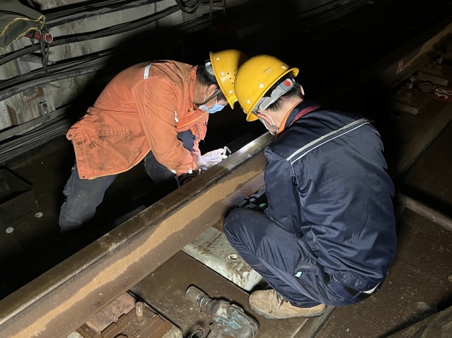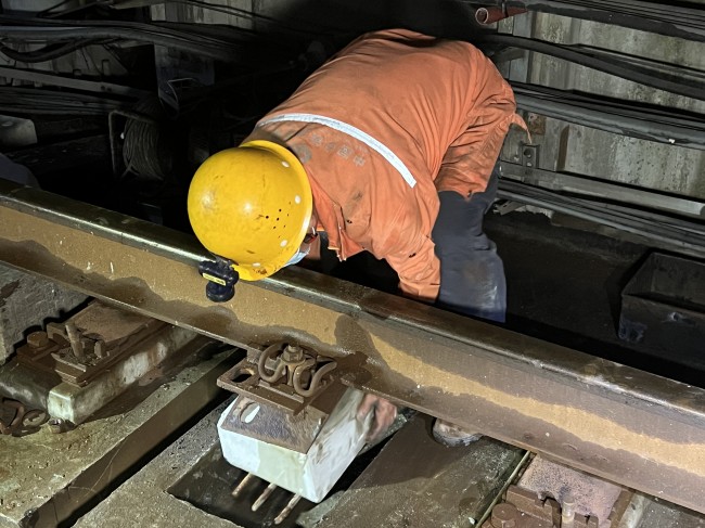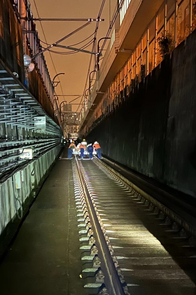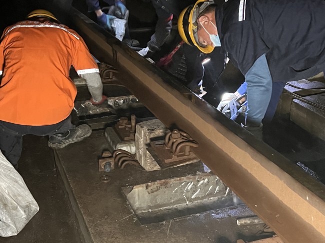 11月29日凌晨,中铁四局上海地铁维保项目部大修班组进行地铁4号线宜山路高架段轨道弹性支撑块改造任务,适逢上海天气欠佳,细雨朦胧。