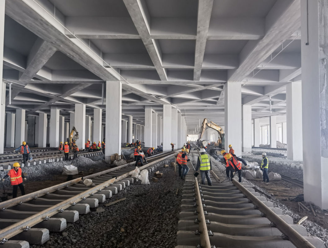 温州市域铁路S2线瑞安车辆段为上盖式结构,所有轨道均位于盖下。轨道工程施工主要为瑞安车辆段库外线及库内线的铺轨施工,主要铺轨工程量为:铺轨9.55km(碎石道床8.19km,无砟道床架轨1.36km),道岔33组,步行板800m,车挡24处,减振垫25876.2㎡,C35混凝土5725m3,道砟35701m3,无缝线路6.48km。