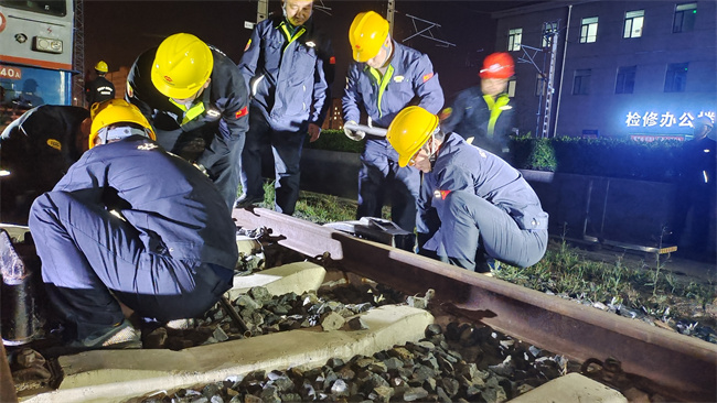 为确保运输生产各项工作有序进行,提高朔黄运输分处检修车间救援队整体实际操作技能,5月3日晚20点,分处组织在黄骅港折返段14道进行复轨器实作演练。共计15名队员参加。