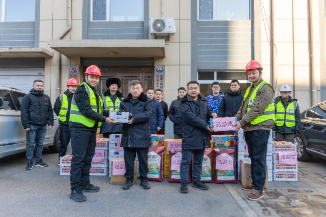 活动现场,项目管理人员将牛奶、水果、米面粮油等慰问品送到一线工友手中,并详细询问作业环境和身体状况,对广大工友在寒冬中坚守岗位的奉献精神表示感谢,亲切叮嘱大家在低温天气下要注意防寒保暖,合理安排工作时间,确保自身安全和身体健康。