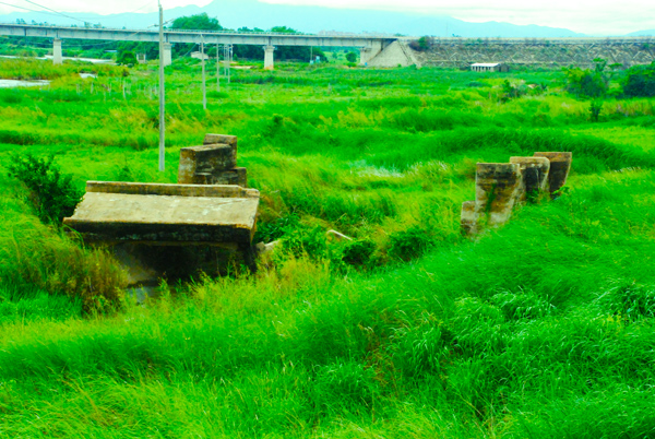 图片:近处残败的桥墩是日本侵琼时修筑的铁路遗迹,远处为既有西环铁路,为客货两用。