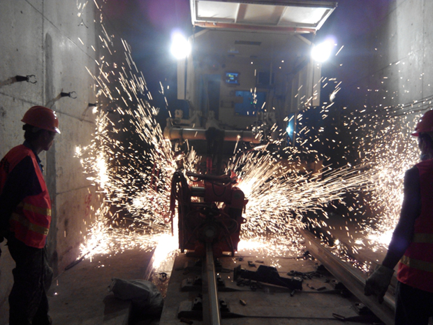 2016年4月13日下午,南宁地铁项目部的焊轨人员兴奋不已,标段内最后一对钢轨即将焊接完成。至此,八分公司南宁地铁项目部承建的南宁市轨道交通1号线一期工程轨道工程施工01标段实现全线长轨通目标。