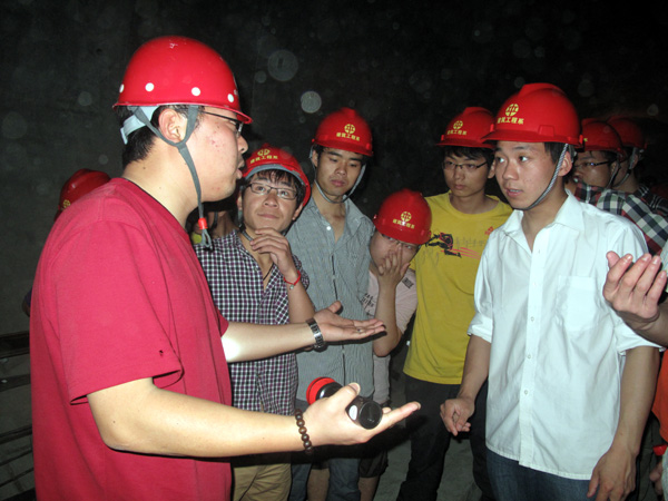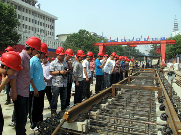 在铺轨基地,郑州地铁项目工程技术主管魏常友向大家介绍了混凝土养生、轨道精调等专业知识,使参观的学子们耳目一新。地铁施工新技术、新设备、新知识的学习,让同学们受益匪浅,大家深深地被员工师傅严谨工作作风和吃苦耐劳精神所感动,期待下一次的参观学习。