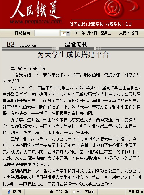 《人民铁道》:中铁四局八分公司为大学生成长搭建平台