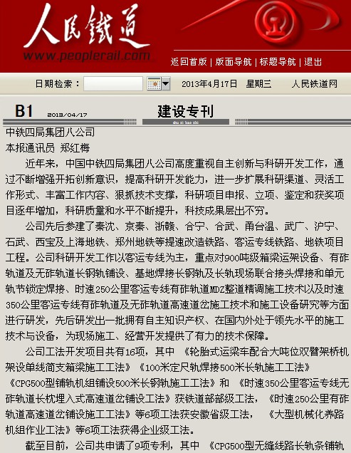 《工人日报》:中铁四局八分公司科研创新成果丰硕
