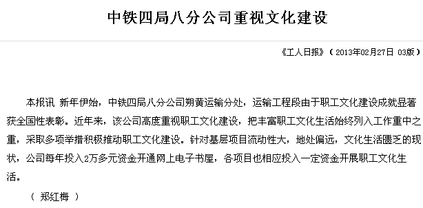 《工人日报》:中铁四局八分公司重视文化建设