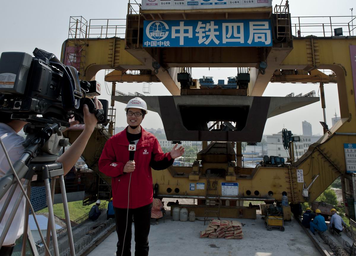5月5日,安徽卫视“走基层”栏目组来到公司承担的合肥铁路枢纽南环线项目现场,采访拍摄了该项目重点控制工程——经开区特大桥900吨箱梁架设作业。箱梁架设施工工艺复杂、科技含量高,受到各大媒体广泛关注,工人日报、人民网、安徽电视台曾等多次报道。(丁伟、杨谦)