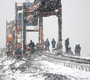 4月23日,一场大雪加冰雹袭击内蒙古锡林浩特市,承担锡乌铁路铺架施工任务的中铁四局八分公司积极行动起来,采取措施抗击雪灾,确保铺架安全。图为该项目部员工冒雪架设跨S307省道联结线大桥。
