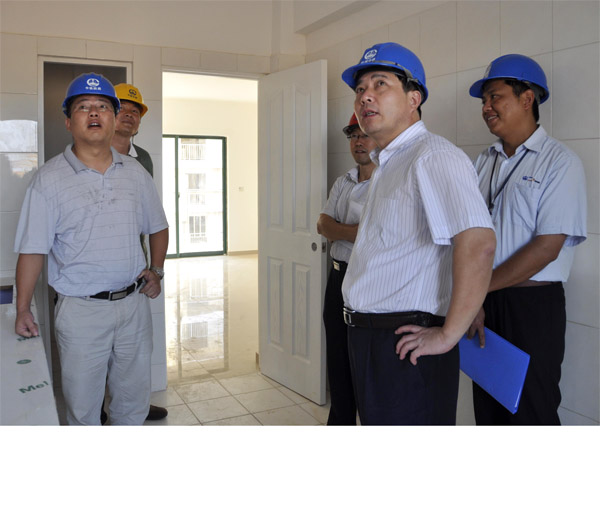 10月16日局总经理许宝成、副总经理邵刚一行在八分公司总经理李朋谦的陪同下依次对由八公司承建的安哥拉房建工程第一批即将交验的五区框架楼和在建的四区、二区房建工程进行了实地检查,并看望了八公司安哥拉项目部参战员工。